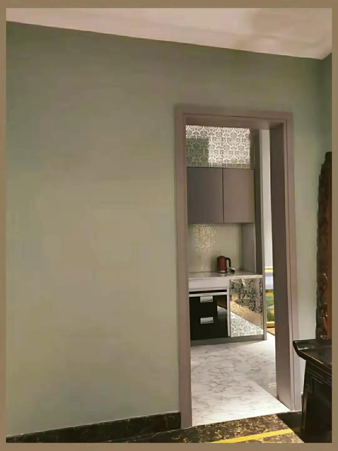 餐厅和客厅连着,配色和卧室大同小异,白色的顶棚,大面积灰绿色平铺墙面,搭配奶油灰大门,突显出淡淡的格调,更显高级。灰绿色墙壁搭配原木色桌椅,一股清新劲儿油然而生。