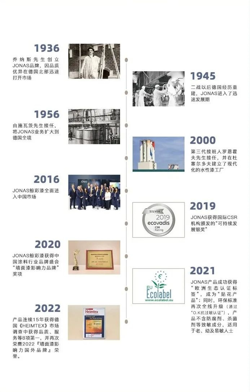 JONAS鲸彩漆由乔纳斯先生于1936年,在欧洲时尚之都——德国北莱茵•威斯特法伦州的首府杜赛尔多夫创立,是德国总统府合作品牌。鲸彩漆始终专注生产高品质的水性建筑装饰漆,拥有德国工业4.0现代化工厂,致力于水性建筑装饰涂料领域领先技术的研究和创新。