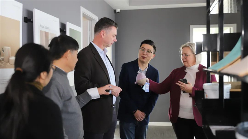 展会结束后的第二天,Falk先生与Heiden女士于12月12日亲赴缔邸家居中国鲸彩漆总部,双方就鲸彩漆近年来的业务发展进行了深入的沟通交流,研讨鲸彩产品优势及研发升级的技术手段,并分享对未来的发展规划。