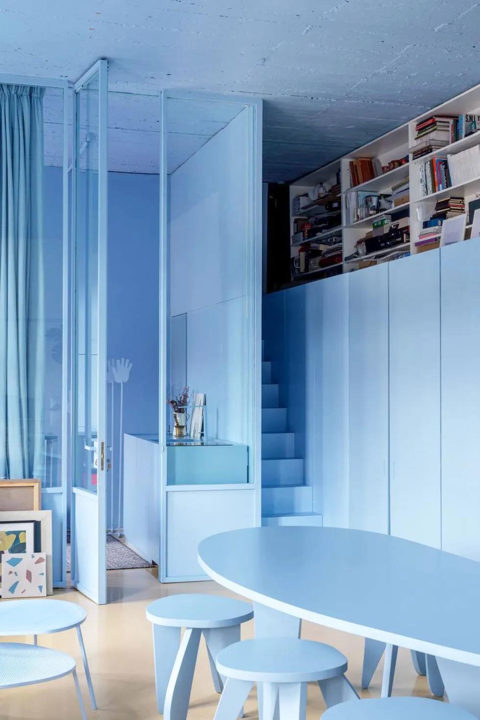 同样的,如果你没有足够的空间来储存你所有的书,但是有超高的天花板,请使用垂直空间!在这里,设计师打破了粉蓝色的单色,在尖顶的墙上布置了一个白色的小房间。