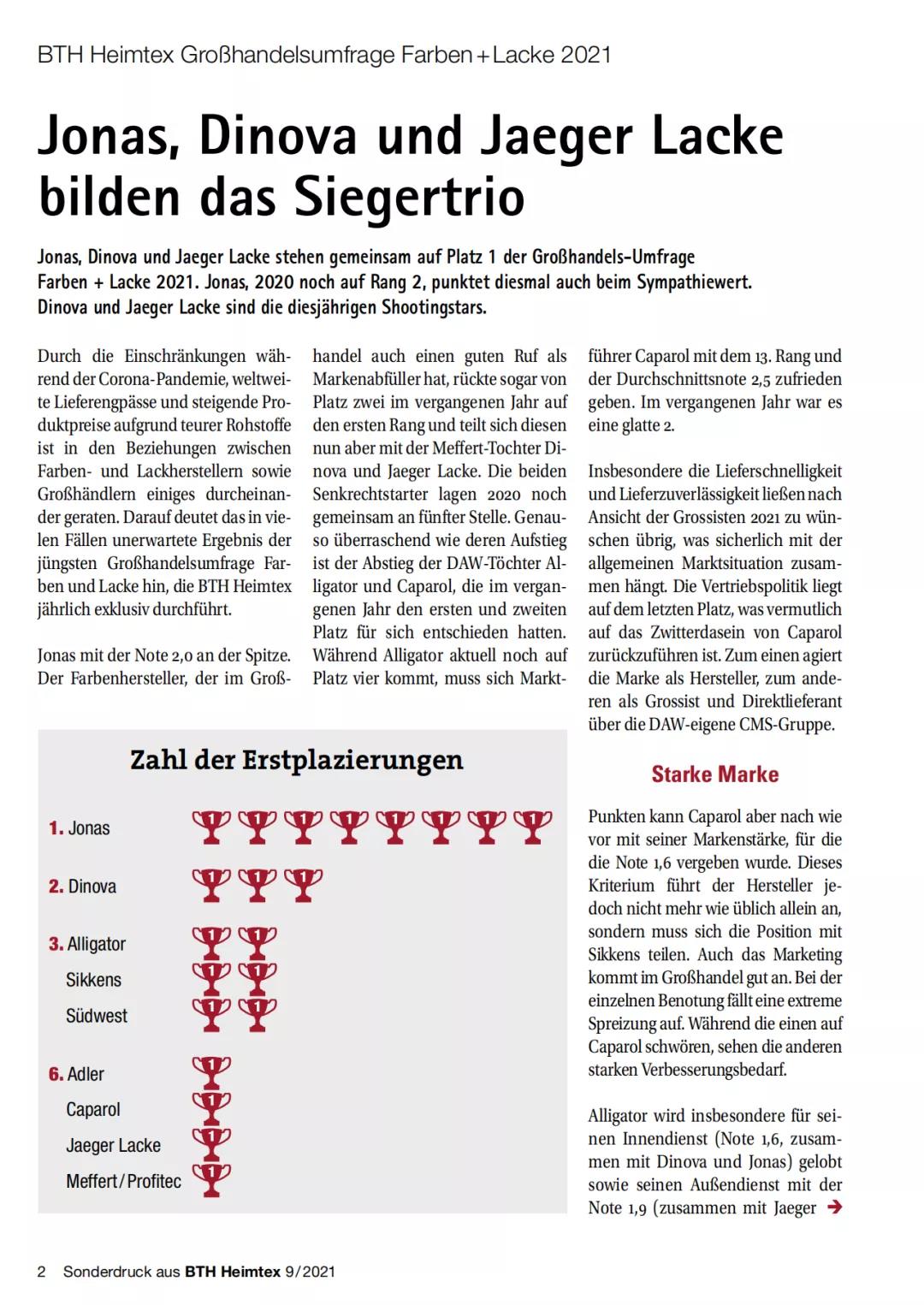 近日,欧洲权威家居产品杂志《Heimtex》对德国本土最具代表性的知名涂料品牌进行了权威测评。德国鲸彩漆在全部13项调查内容中,荣获其中8项排名冠军,完胜包括Dinova(迪诺瓦)、Caparol(卡普乐尔)、Meffert(梅菲特工业)等在内的多家德国涂料品牌,在德国涂料行业依旧保持着龙头地位。