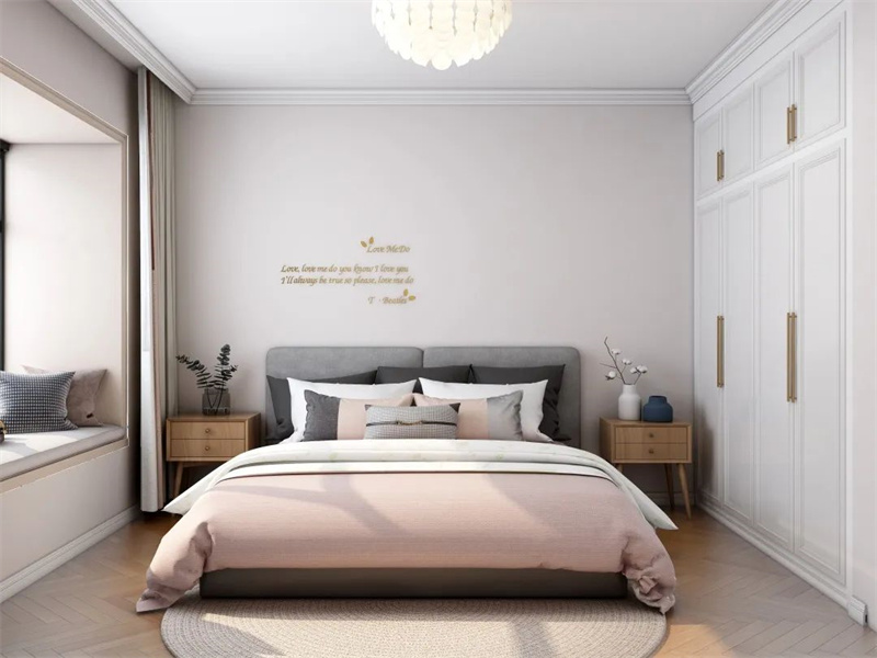 主卧大面积白色壁柜与粉灰色墙壁画风十分贴合,同色系线条利落的飘窗增加了空间的纵深感,让房间看上去更为立体,深空灰与香槟粉组成的床面,高级又不失温馨。休息的房间最适宜用低饱和度的色系,过亮或过暗都会对长期的睡眠质量产生负面影响。