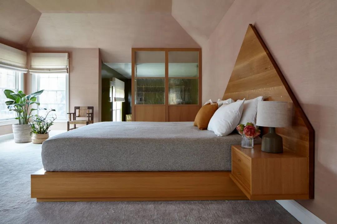 如果想为一间极简主义的房间找到一个明确的主题,几何元素是一个不错的选择。三角形的床头板是这间卧室的亮点,除此之外,家具的形状都具有明显的几何特征,所以才会如此简单明了。灰粉色的草布壁纸为它带来了温暖和质感,在窗前,两盆绿色植物提醒居住者注意窗外生机勃勃的世界。